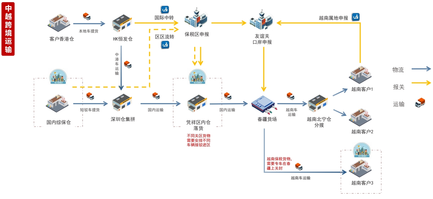 我们拥有中越/中泰成熟完善的仓情配送和关务服务体系,紧密连接广西凭祥和越南泰国的干线网络,为跨境制造和贸易企业量身打造中越往返跨境门到门的优质运输服务,助力企业在跨境业务中畅通无阻。
